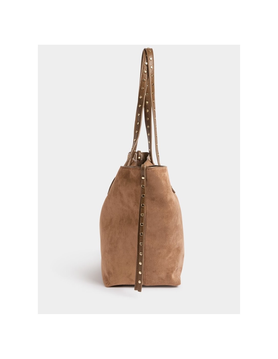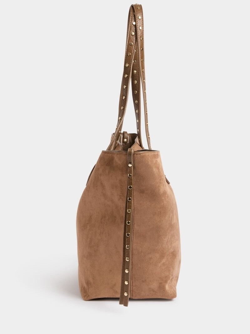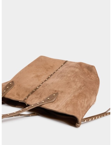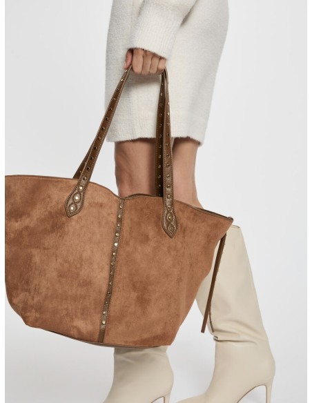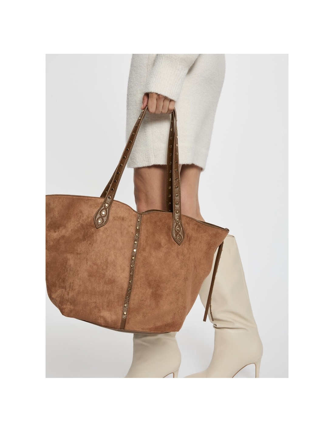 Bolso shopper en acabado ante marrón. Tachuelas en la doble asa y en el frente en color dorado. En el interior incluye un bolso adicional con cierre de cremallera.