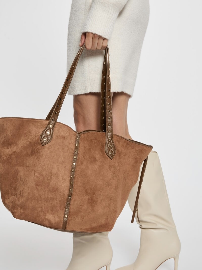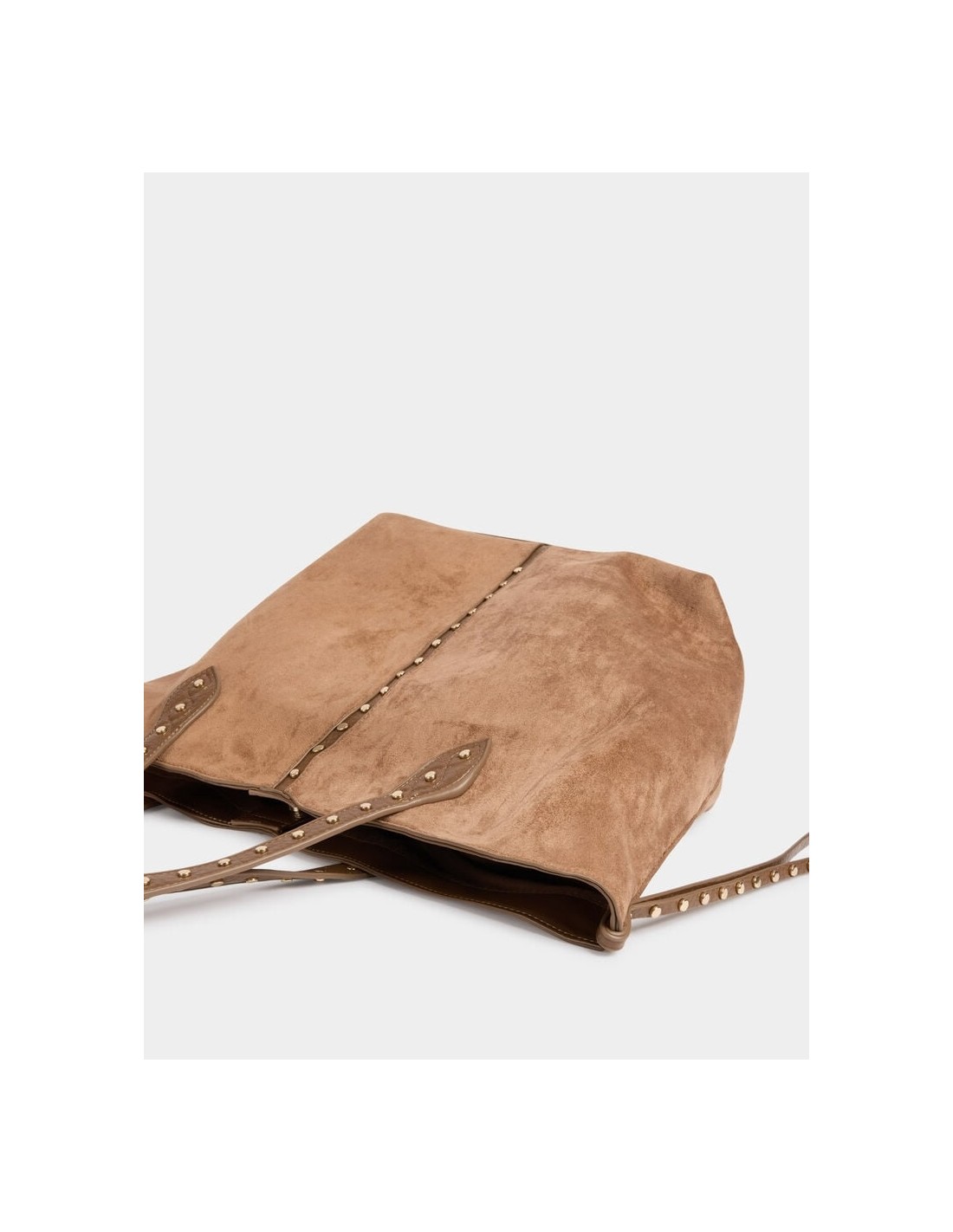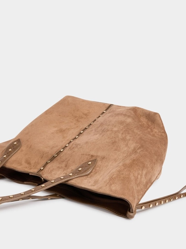 Bolso shopper en acabado ante marrón. Tachuelas en la doble asa y en el frente en color dorado. En el interior incluye un bolso adicional con cierre de cremallera.