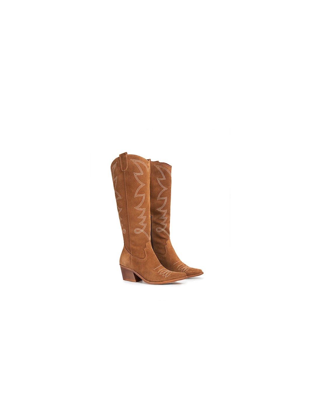 Esta bota cowboy de serraje color marrón, con caña ancha y alta, elevará todos tus outfit esta temporada.