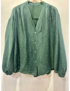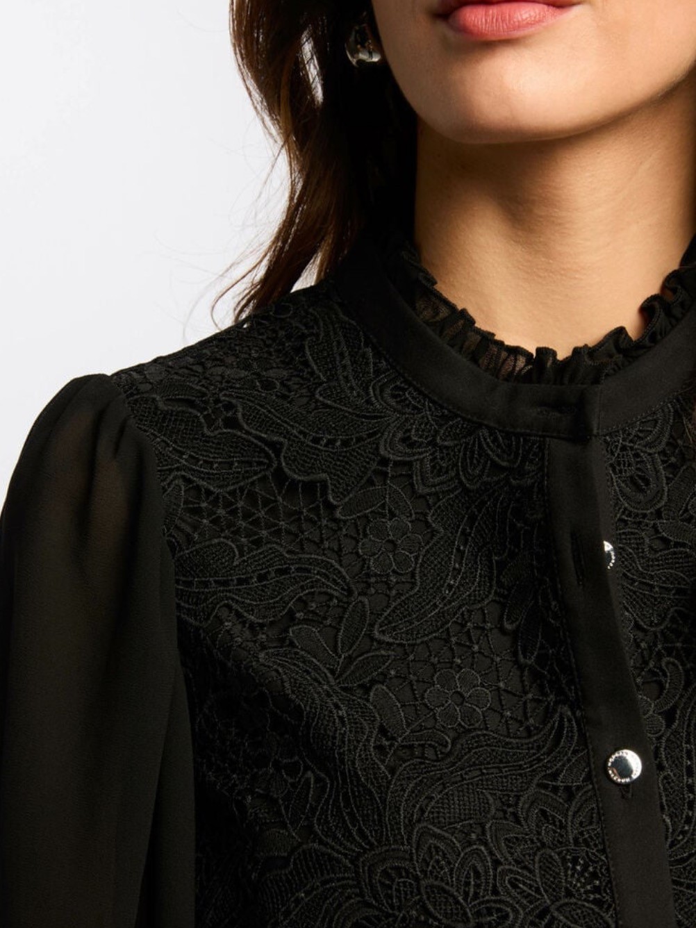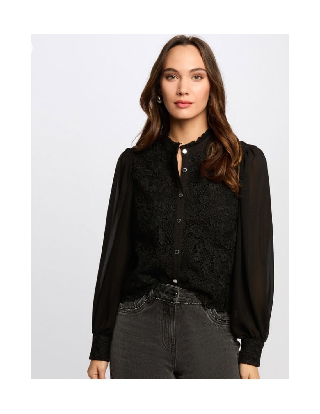 Camisa de color negro, manga larga abullonada, con detalles de guipur en pecho y puños. Composición: 100% poliester (50% reciclado)